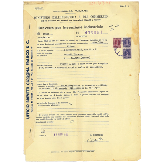 Il 28 Gennaio 1946 viene depositato il primo brevetto ufficiale, con approvazione nel Giugno del 1948, dal ministero dell’industria e del commercio. Vincenzo Montoli e Figli, basandosi sulla ricerca e sullo sviluppo, riesce a trasformare le sue idee innovative in una realtà concreta e di successo. Il primo brevetto fu reso operativo su delle particolari cesoie a lama curva per il taglio del gesso.